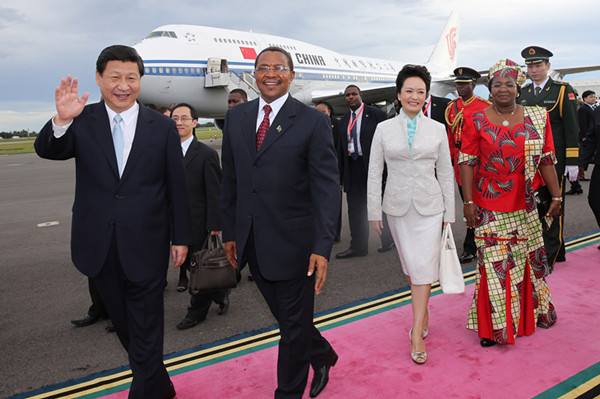 圖為2013年3月24日,國家主席習近平乘專機抵達達累斯薩拉姆尼雷爾國際機場,開始對坦桑尼亞進行國事訪問。坦桑尼亞總統(tǒng)基奎特和夫人到機場迎接習近平和夫人彭麗媛。(新華社記者 蘭紅光攝)