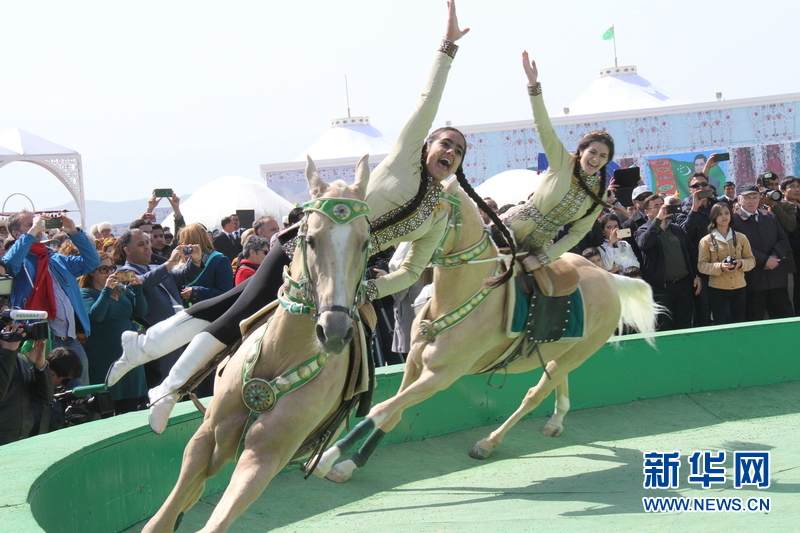 3月21日,在土庫曼斯坦首都阿什哈巴德,演員們表演汗血馬馬術(shù)。新華社記者盧敬利 攝