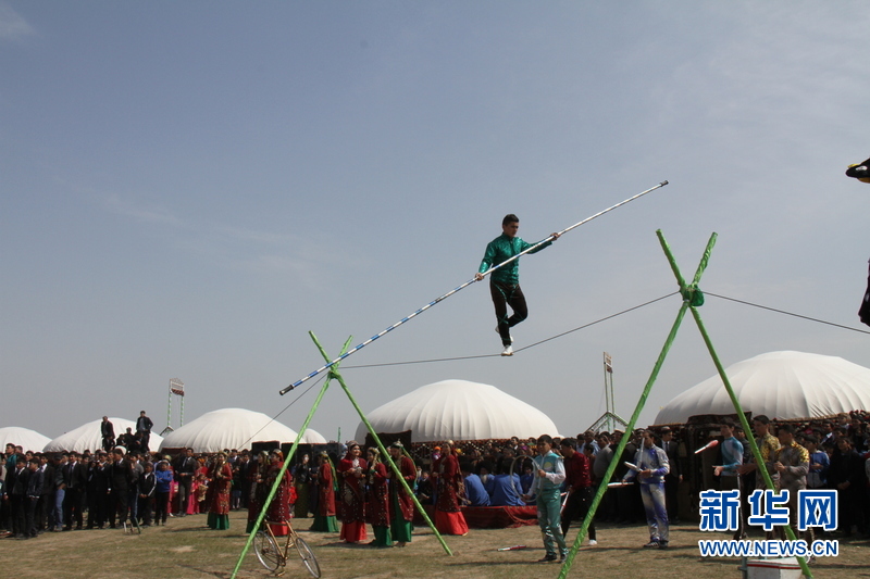 3月21日,在土庫曼斯坦首都阿什哈巴德,演員走鋼絲。新華社記者盧敬利 攝