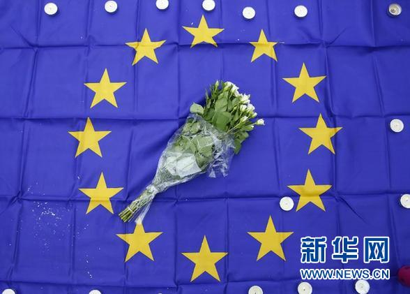 3月23日,在比利時首都布魯塞爾市中心的股票交易所前,一束鮮花和蠟燭擺放在歐盟旗幟上。當日,數(shù)千民眾自發(fā)聚集在股票交易所前,為恐怖襲擊遇難者集體默哀。 新華社記者 葉平凡 攝