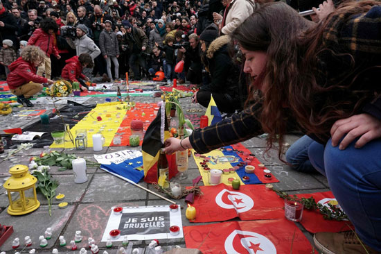 3月23日,在比利時(shí)布魯塞爾,人們?cè)诘磕罨顒?dòng)中擺放蠟燭。22日在比利時(shí)首都布魯塞爾發(fā)生的系列恐怖襲擊已造成至少34人死亡,270多人受傷。事發(fā)后,布魯塞爾多地舉行活動(dòng),悼念恐怖襲擊事件中的遇難者。新華社/法新