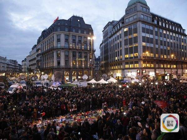 布魯塞爾,數(shù)百民眾圍聚在廣場(chǎng)上,悼念恐襲遇難者。(圖片來源:新華/法新)