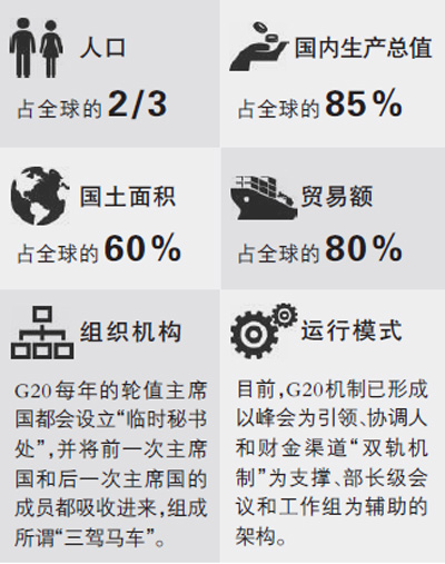 成員:包括美國、日本、德國、法國、英國、意大利、加拿大、俄羅斯、韓國、澳大利亞、南非、阿根廷、巴西、印度、印度尼西亞、墨西哥、沙特阿拉伯、土耳其、中國和作為一個實體的歐盟。記者 王慧敏 王新萍 方 敏