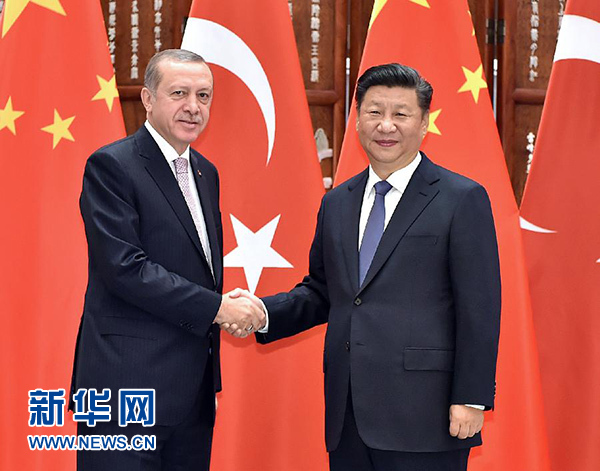9月3日,國(guó)家主席習(xí)近平在杭州會(huì)見(jiàn)來(lái)華出席二十國(guó)集團(tuán)領(lǐng)導(dǎo)人杭州峰會(huì)的土耳其總統(tǒng)埃爾多安。新華社記者 李濤 攝