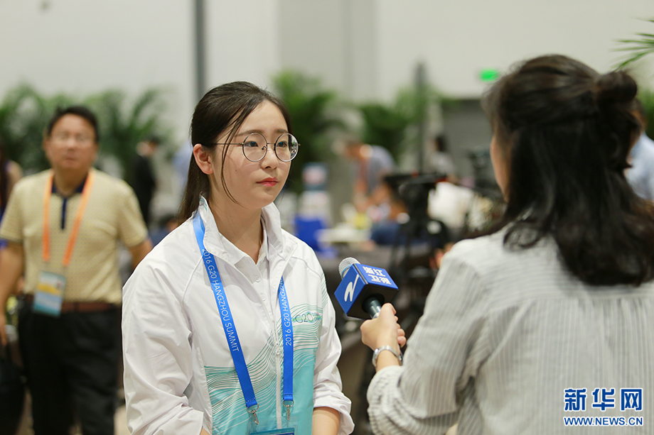 ????9月4日至5日,二十國集團領導人杭州峰會在浙江杭州舉行。全球媒體人匯聚一堂,關注報道峰會盛況。在G20杭州峰會新聞中心,200多位志愿者身著青白色運動服,男生外套上藍下白,象征層巒疊嶂;女生外套上白下藍,意味水波蕩漾。兩者輝映,體現了杭州這座古城湖光山色的獨特風韻。
