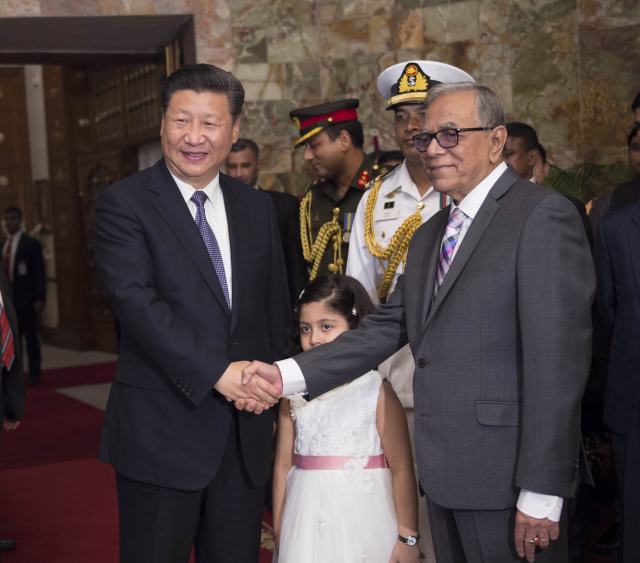 【中孟兩國友誼代代相傳再寫佳話】14日中午,習(xí)近平主席抵達(dá)孟加拉國首都達(dá)卡,在機(jī)場受到熱烈歡迎。哈米德總統(tǒng)親自到機(jī)場迎接,并帶來自己的小孫女向習(xí)主席獻(xiàn)上鮮花。無獨(dú)有偶,1956年,周恩來總理訪問孟加拉國時(shí),孟加拉國國父拉赫曼帶著女兒向周總理獻(xiàn)花。當(dāng)年那位獻(xiàn)花的小姑娘正是現(xiàn)在的孟加拉國總理哈西娜。習(xí)主席深情地對孟加拉國領(lǐng)導(dǎo)人說:“這是中孟兩國友誼代代相傳的佳話?!?/p>