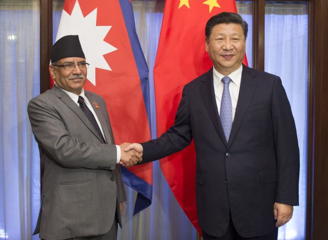 圖為10月15日,國家主席習(xí)近平在印度果阿會見尼泊爾總理普拉昌達(dá)。(新華社記者謝環(huán)馳攝)