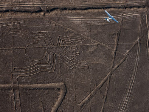 ????站在地面上的話,你幾乎看不到納斯卡線,它們由淺色泥土畫成,兩邊由深色石頭畫的線來提亮。這個(gè)地區(qū)有數(shù)量眾多的納斯卡線——長(zhǎng)達(dá)幾千米的碎片狀的三角形和矩形,非寫實(shí)的動(dòng)物和鳥類圖案:一只猴子,一只禿鷹,一只完全對(duì)稱的蜘蛛,一只蜂鳥。