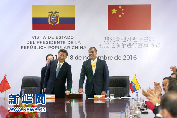 新華社基多11月18日電(記者王聰 霍小光)國家主席習近平18日在基多同厄瓜多爾總統(tǒng)科雷亞共同出席中方援建的厄瓜多爾公共安全應急指揮中心聯(lián)合實驗室揭牌儀式,喬內(nèi)醫(yī)院奠基、科卡科多-辛克雷水電站竣工發(fā)電視頻連線活動。