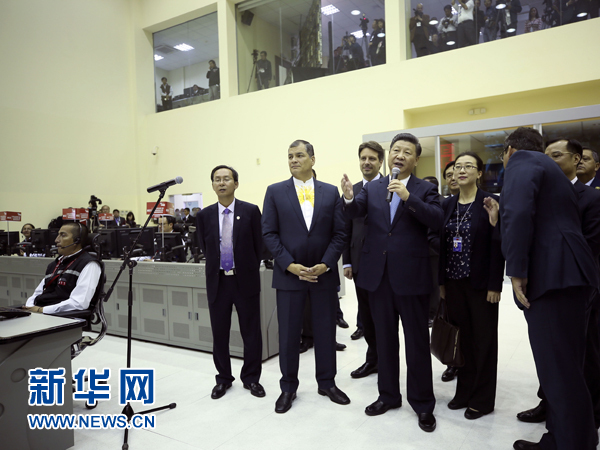 習近平抵達公共安全應急指揮中心時,科雷亞在門口迎接。兩國元首共同參觀中方支援厄瓜多爾抗震救災圖片展,并為厄瓜多爾公共安全應急指揮中心聯(lián)合實驗室揭牌。兩國元首觀看介紹喬內(nèi)醫(yī)院和辛克雷水電站的視頻,并同項目現(xiàn)場人員連線互動。喬內(nèi)醫(yī)院現(xiàn)場中方負責人向兩國元首報告醫(yī)院工程正式開工。在辛克雷水電站,專程前往現(xiàn)場的厄瓜多爾副總統(tǒng)格拉斯介紹項目完成情況。兩國元首共同按動按鈕,辛克雷水電站正式竣工發(fā)電。