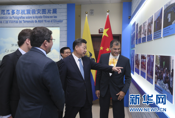 當?shù)貢r間11月18日,國家主席習近平在基多同厄瓜多爾總統(tǒng)科雷亞共同出席中方援建的厄瓜多爾公共安全應急指揮中心聯(lián)合實驗室揭牌儀式,喬內(nèi)醫(yī)院奠基、科卡科多-辛克雷水電站竣工發(fā)電視頻連線活動。這是兩國元首共同參觀中方支援厄瓜多爾抗震救災圖片展。新華社記者 蘭紅光 攝