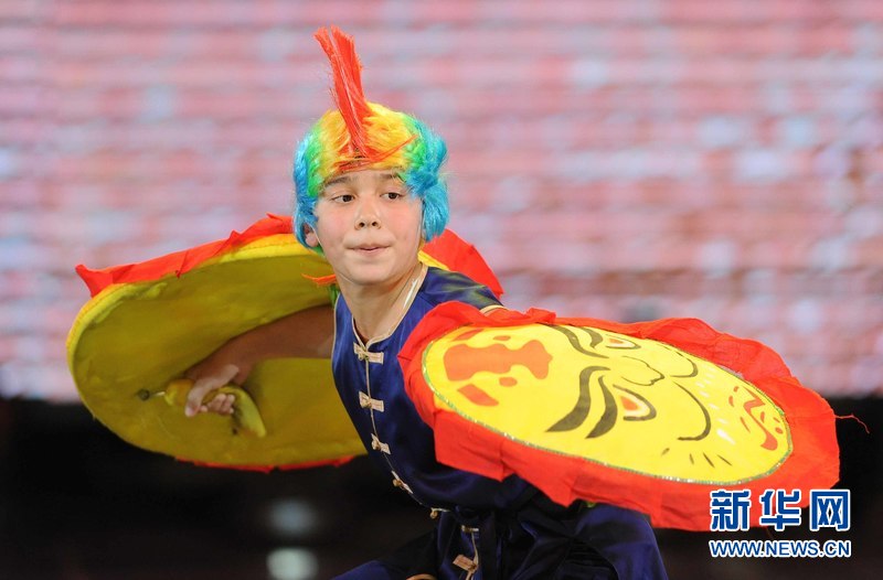 1月18日晚,烏茲別克斯坦首都塔什干人民友誼宮,烏茲別克斯坦中華民族文化中心武術(shù)隊(duì)隊(duì)員在表演武術(shù)。新華網(wǎng)記者 沙達(dá)提 攝