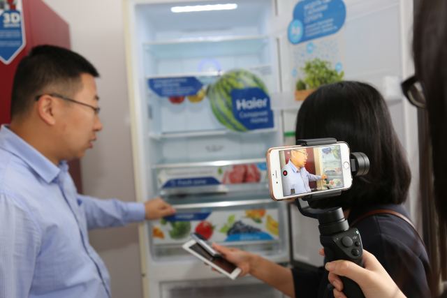 海爾在俄羅斯韃靼斯坦共和國的冰箱工廠內(nèi),海爾員工介紹冰箱功能。(新華社記者趙宇攝)