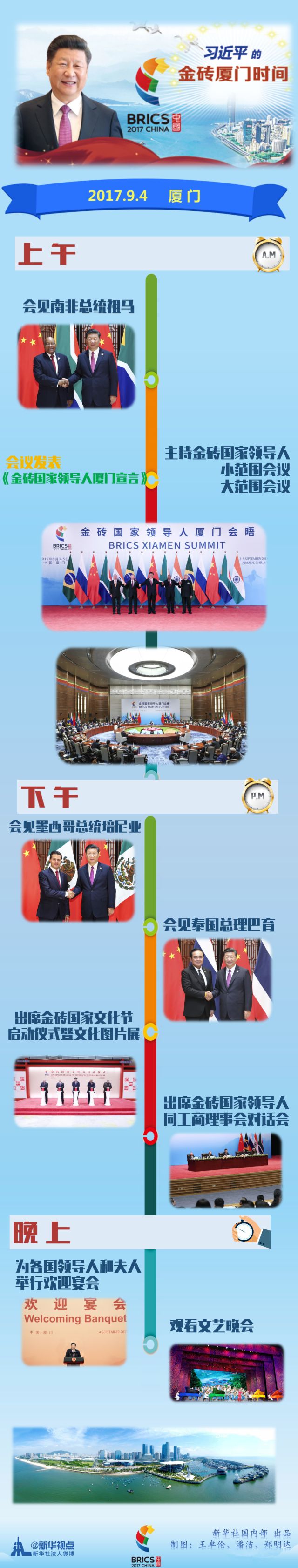 廈門,顧名思義是“大廈之門”。我衷心希望廈門會晤為我們開啟新的合作之門、發(fā)展之門,迎來金磚合作第二個(gè)“金色十年”,開辟新興市場國家和發(fā)展中國家光明未來。