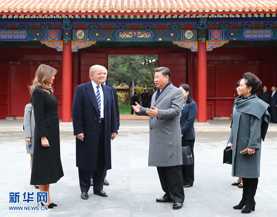 11月8日下午,國家主席習(xí)近平和夫人彭麗媛在北京故宮博物院迎接來華進(jìn)行國事訪問的美國總統(tǒng)特朗普和夫人梅拉尼婭。兩國元首夫婦在寶蘊(yùn)樓簡(jiǎn)短茶敘。新華社記者謝環(huán)馳攝