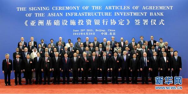 【正式成立】2015年12月25日,歷經(jīng)800余天籌備,由中國(guó)倡議成立、57國(guó)共同籌建的亞洲基礎(chǔ)設(shè)施投資銀行(亞投行)于當(dāng)日正式成立,全球迎來首個(gè)由中國(guó)倡議設(shè)立的多邊金融機(jī)構(gòu)。圖為2015年6月29日,國(guó)家主席習(xí)近平在北京人民大會(huì)堂會(huì)見出席《亞洲基礎(chǔ)設(shè)施投資銀行協(xié)定》簽署儀式的各國(guó)代表團(tuán)團(tuán)長(zhǎng)。