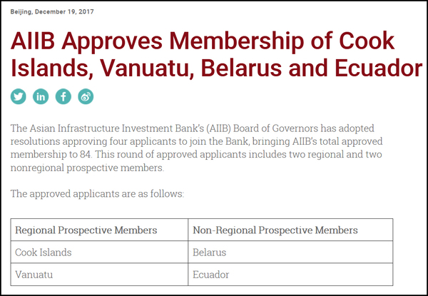 【第四次“擴(kuò)容”】2017年12月19日,亞投行宣布批準(zhǔn)庫克群島、瓦努阿圖、白俄羅斯和厄瓜多爾四個(gè)成員的加入申請(qǐng),成員增至84個(gè),這是亞投行自開業(yè)以來的第四次“擴(kuò)容”。圖為亞投行官網(wǎng)截圖。(新華網(wǎng)國(guó)際頻道 徐海知)