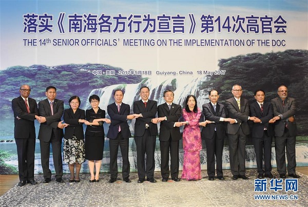 5月18日,與會(huì)代表在出席落實(shí)《南海各方行為宣言》第14次高官會(huì)前合影留念。5月17日至18日,中國(guó)與東盟國(guó)家在貴州省貴陽(yáng)市舉行落實(shí)《南海各方行為宣言》第14次高官會(huì)和第21次聯(lián)合工作組會(huì)。新華社記者 劉續(xù)攝