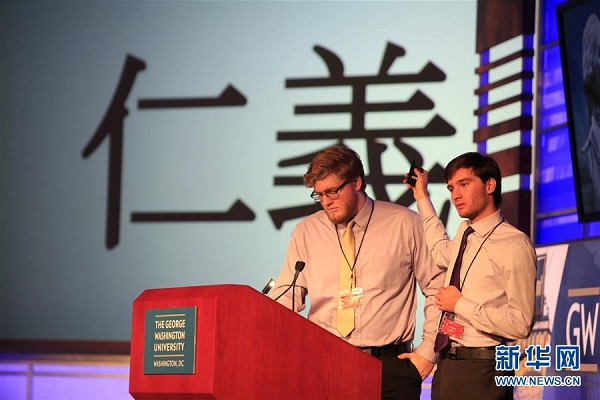 11月18日,在美國(guó)首都華盛頓的喬治·華盛頓大學(xué),參賽選手進(jìn)行中文演講。美國(guó)喬治·華盛頓大學(xué)中國(guó)學(xué)生學(xué)者聯(lián)合會(huì)和喬治·華盛頓大學(xué)孔子學(xué)院聯(lián)合主辦的第一屆“華語(yǔ)擂臺(tái)”漢語(yǔ)辯論賽18日落下帷幕。來(lái)自賓夕法尼亞州、猶他州、佛羅里達(dá)州等美國(guó)多地的10名參賽者兩兩組隊(duì),通過(guò)成語(yǔ)挑戰(zhàn)、現(xiàn)場(chǎng)問(wèn)答和團(tuán)隊(duì)辯論三種形式,展示了各自的漢語(yǔ)知識(shí)、語(yǔ)言和思辨能力及個(gè)人風(fēng)采。新華社記者 楊承霖 攝