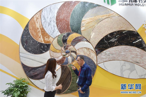 敘利亞客商默罕默德(右)在一家國(guó)內(nèi)石材企業(yè)展位的“海螺狀”石材墻前(11月8日攝)。11月8日,第十八屆中國(guó)(南安)水頭國(guó)際石材博覽會(huì)在福建省南安市水頭鎮(zhèn)舉辦。 新華社記者 宋為偉 攝