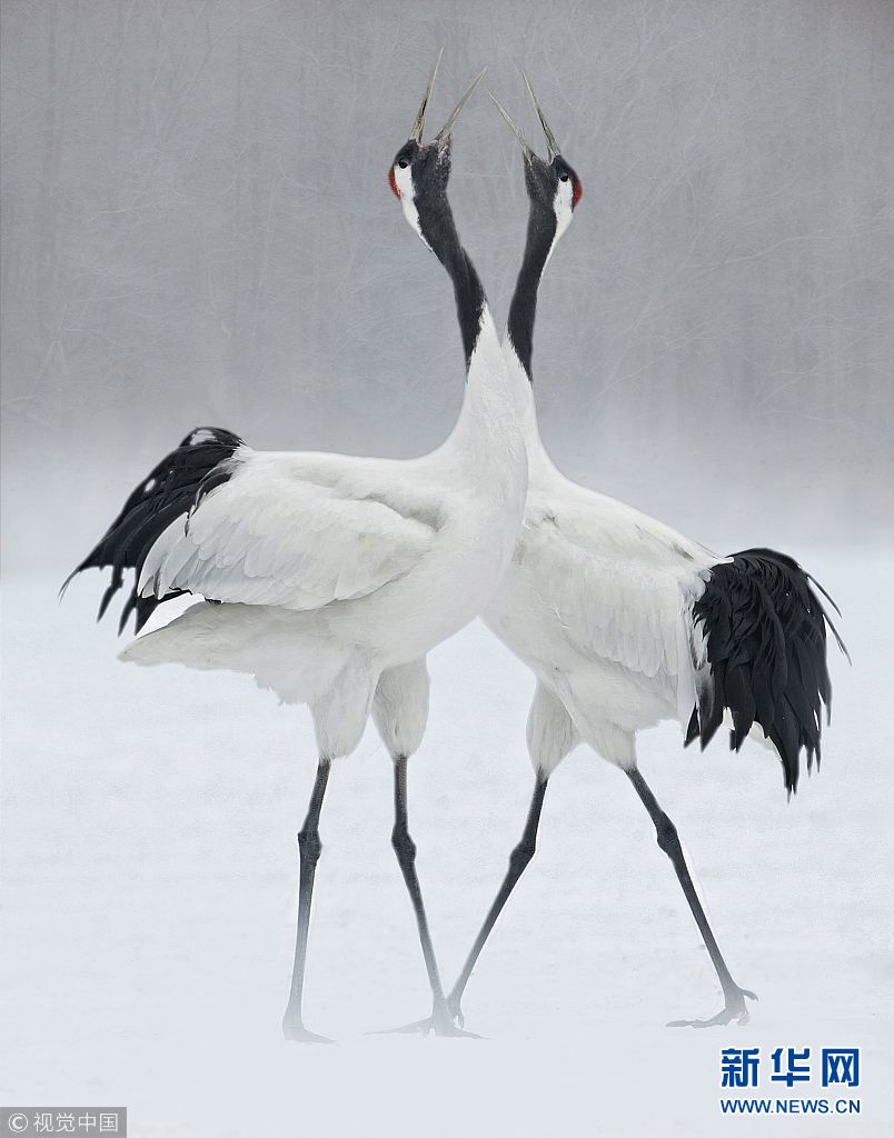 12月25日訊(具體拍攝時(shí)間不詳),日本北海道,一對(duì)丹頂鶴在冰面上翩翩起舞,動(dòng)作驚人一致。(圖片來源:視覺中國)