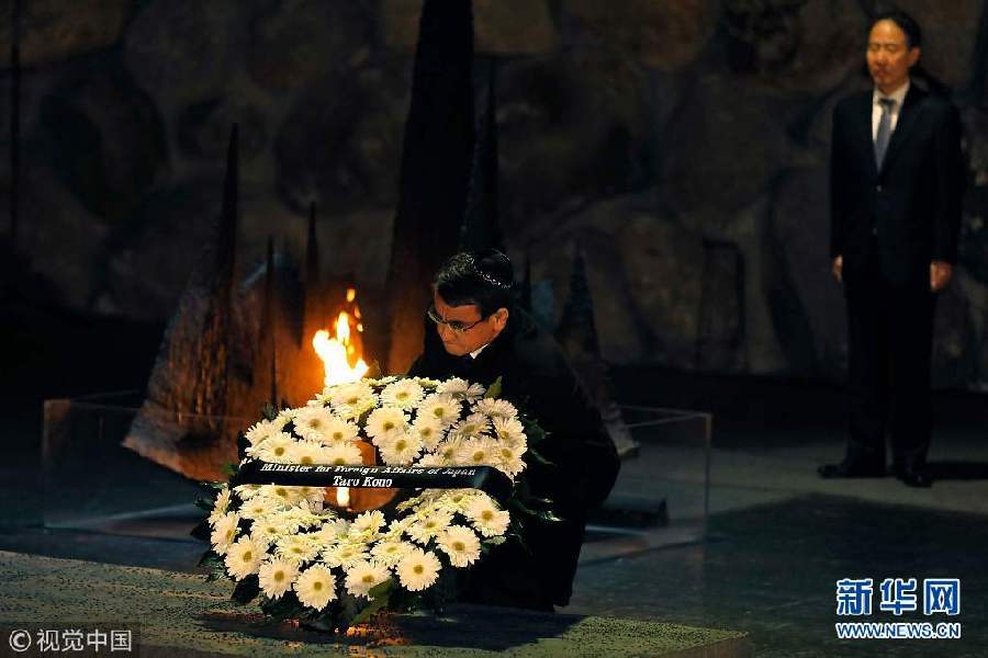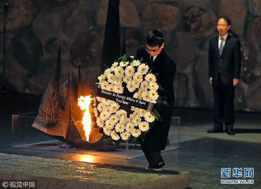 12月25日,耶路撒冷,日本外相河野太郎訪問耶路撒冷,參觀大屠殺紀(jì)念館,獻(xiàn)花悼念死難者。(圖片來源:視覺中國)