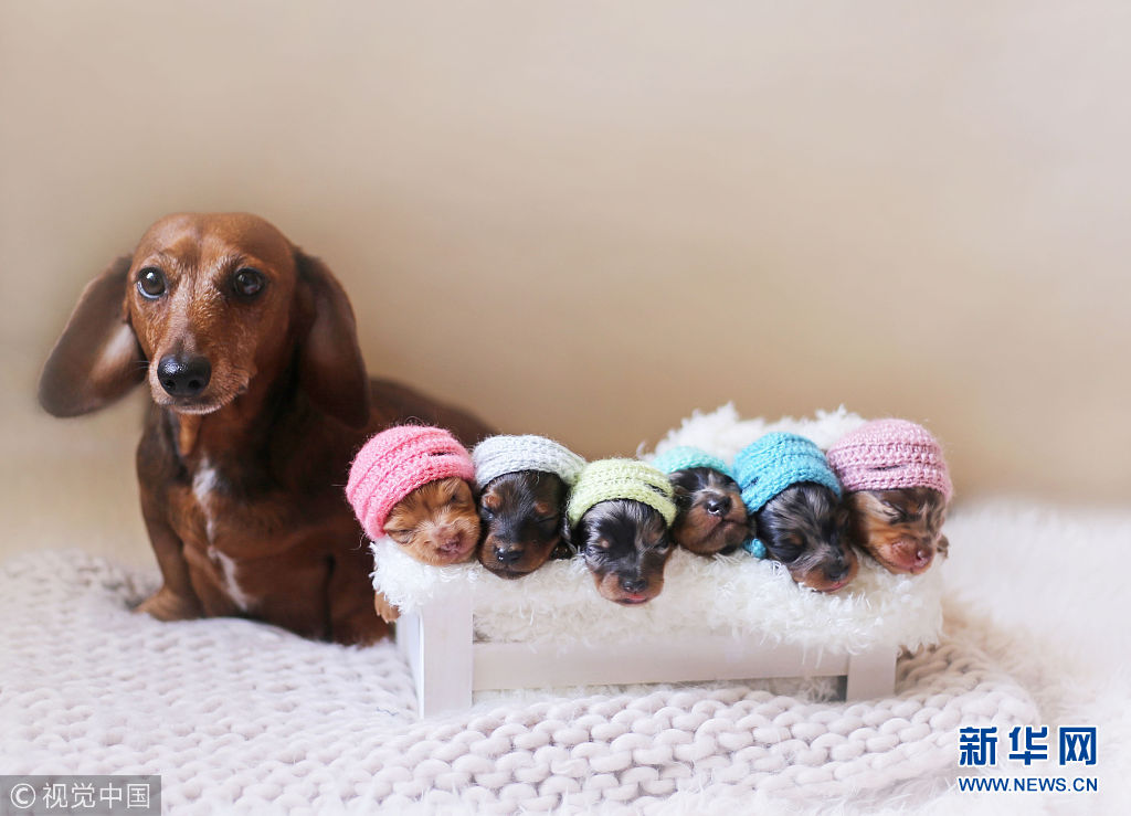 2016年6月12日消息(具體拍攝時間不詳),美國德克薩斯州麥卡倫市,商業(yè)攝影師Belinda Schenk為一對臘腸犬和他們剛出生的6只寶寶拍了一組別出心裁的唯美寫真。(圖片來源:視覺中國)