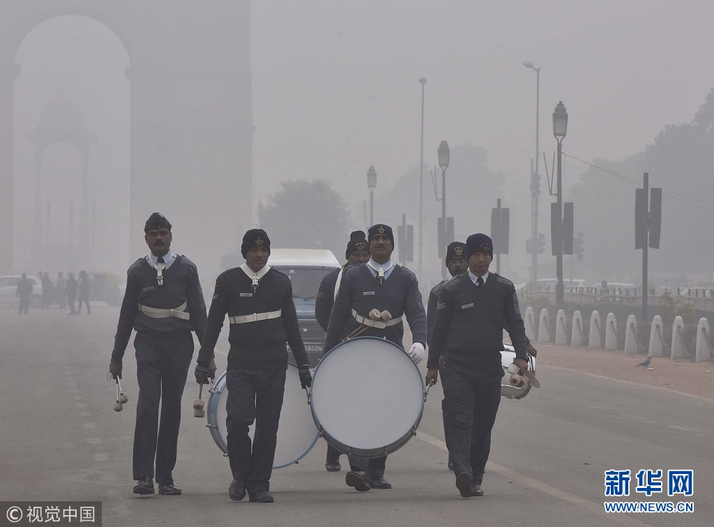 當(dāng)?shù)貢r(shí)間1月2日,印度新德里遭遇冷空氣及強(qiáng)霧霾天氣。軍隊(duì)士兵在霧霾中排練閱兵,為共和國(guó)日閱兵準(zhǔn)備。(圖片來源:視覺中國(guó))