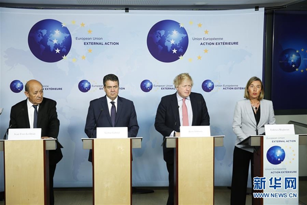 當(dāng)天在與伊朗外長(zhǎng)扎里夫舉行會(huì)談后,莫蓋里尼、法國(guó)外長(zhǎng)勒德里安、德國(guó)外長(zhǎng)加布里爾和英國(guó)外交大臣約翰遜舉行發(fā)布會(huì),強(qiáng)調(diào)了歐方的這一立場(chǎng)。