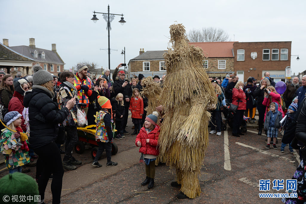 當?shù)貢r間2018年1月13日,英國劍橋郡惠特爾西,民眾打扮成憨厚的“稻草熊”等各種形象,伴隨著樂隊的奏樂游行,慶祝第39屆惠特爾西“稻草熊”節(jié)。(圖片來源:視覺中國)