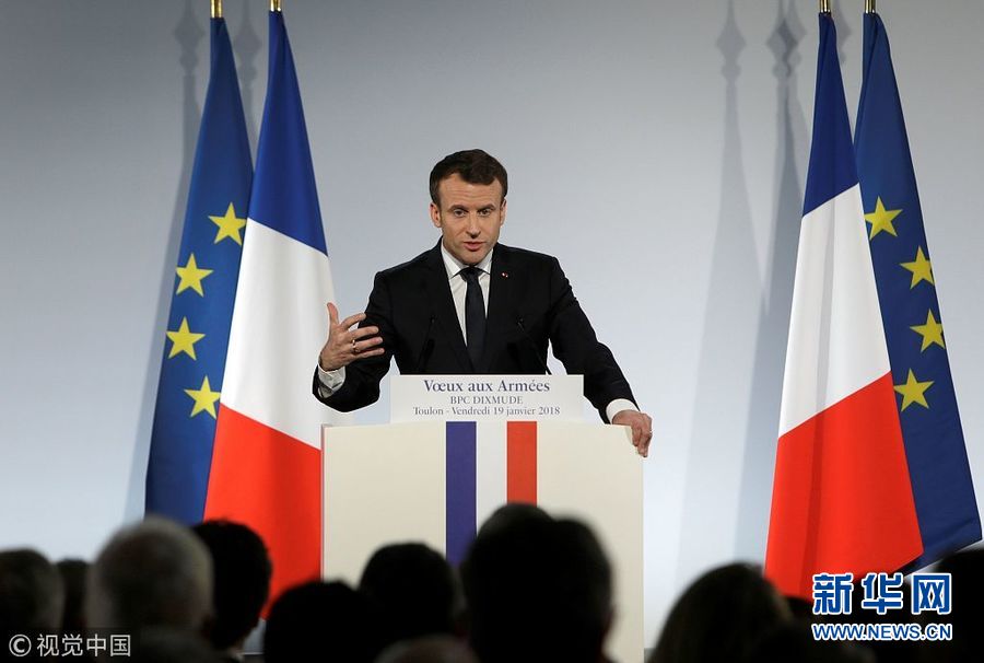 1月19日,法國(guó)土倫,法國(guó)總統(tǒng)馬克龍視察了當(dāng)?shù)氐暮\娀夭⑾蚴勘鴤儼l(fā)表新年祝福。(圖片來(lái)源:視覺(jué)中國(guó))