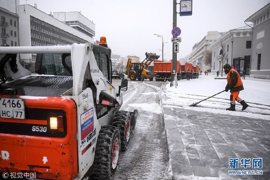 當(dāng)?shù)貢r(shí)間1月20日,俄羅斯莫斯科,工作人員在清理街道上的積雪。 (圖片來源:視覺中國)