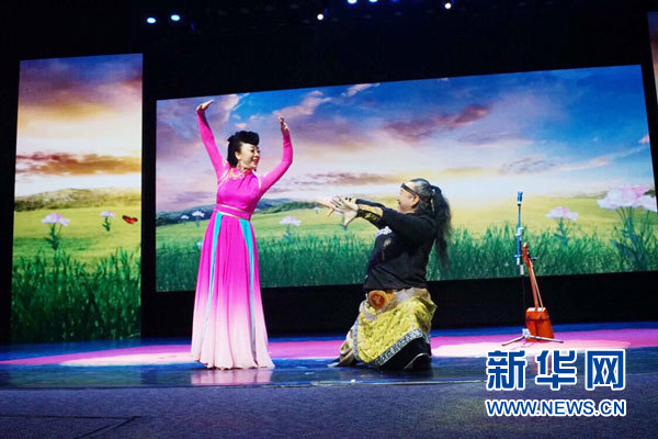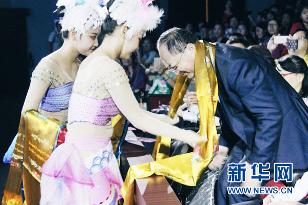 藝術(shù)團演員為現(xiàn)場貴賓敬獻哈達。
