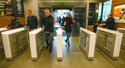 Amazon Go占地約167平方米,包括員工在內(nèi)可容納97人。進(jìn)入店內(nèi)購物前,先要下載相關(guān)智能手機(jī)應(yīng)用,并通過手機(jī)掃碼進(jìn)入一個(gè)類似于地鐵站的閘機(jī)口。進(jìn)入店內(nèi),首先映入眼簾的是可以直接食用的午餐食品,接著是肉類和餐具等雜貨。借助天花板上的大量黑色攝像頭和貨架上的重量傳感器,店方能探測(cè)何人取走了貨物。如果有人拿著商品走出閘門,其關(guān)聯(lián)賬號(hào)就會(huì)扣費(fèi)。反之,如果消費(fèi)者把商品放回貨架,商品則從虛擬購物車中刪除。顧客購物結(jié)束后直接通過閘機(jī)口離店,幾分鐘后將收到亞馬遜發(fā)送的電子收據(jù)。