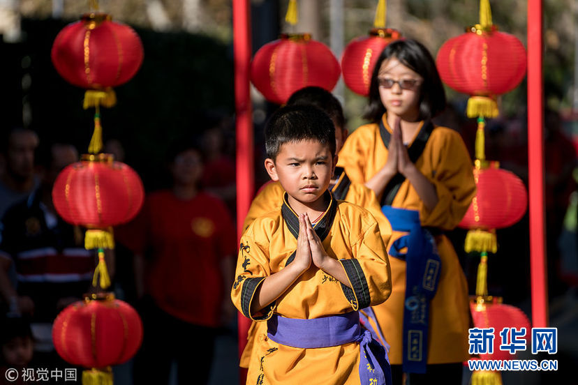 當(dāng)?shù)貢r間1月28日,美國洛杉磯,當(dāng)?shù)谿rove商場舉行少林武術(shù)表演以及其他中國文化類的演出,慶祝傳統(tǒng)新年,場外攤位還有傳統(tǒng)剪紙,捏面人,糖畫,彩繪等項目。圖為少林功夫表演。(圖片來源:視覺中國)