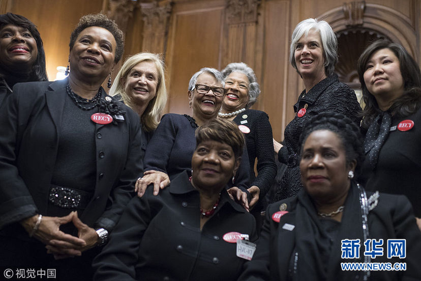 當?shù)貢r間1月30日,美國華盛頓,民主黨國會議員和性侵幸存者一同穿黑衣現(xiàn)身國會大廈,聲援勇敢反對性騷擾和歧視的人們。眾議院民主黨人計劃穿黑衣出席特朗普的國情咨文演講,支持MeToo和TimesUp組織。 (圖片來源:視覺中國)