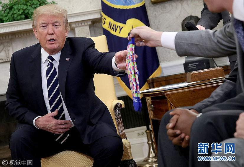 當?shù)貢r間1月31日,美國華盛頓,美國總統(tǒng)特朗普在白宮與公司雇員討論稅收改革問題,獲贈一雙襪子。(圖片來源:視覺中國)