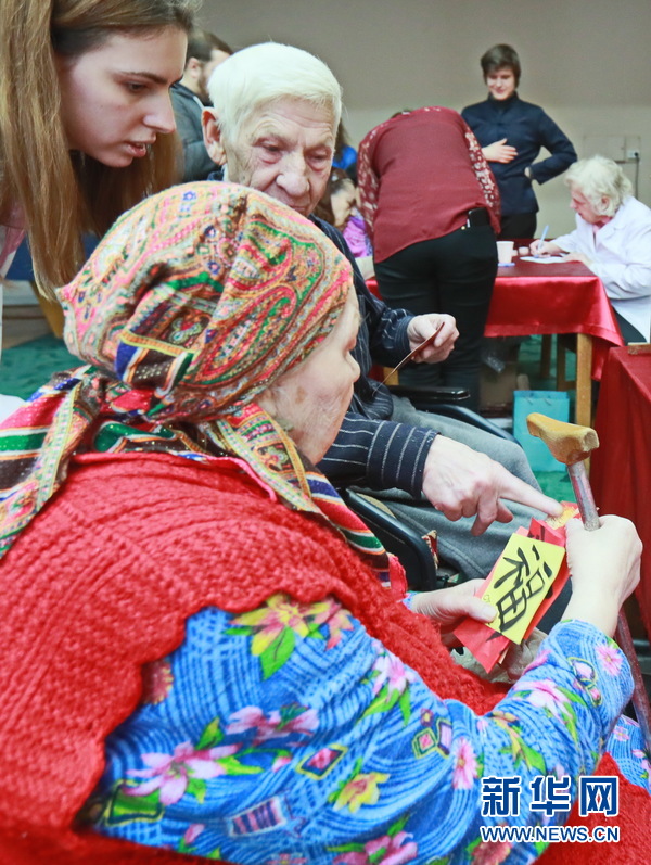 這是7日基輔國立語言大學(xué)孔子學(xué)院與當(dāng)?shù)鼐蠢显号e行2018新春聯(lián)歡晚會時的一幕。當(dāng)晚,孔院30多名師生給敬老院150多名孤殘老人帶來了多個中國文化體驗(yàn)項(xiàng)目,并表演了精彩的文藝節(jié)目。