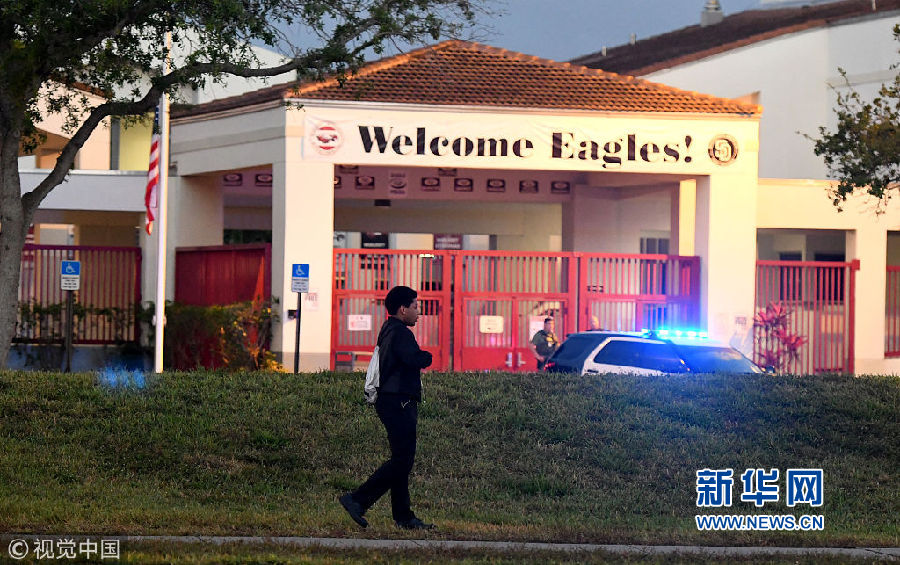 當(dāng)?shù)貢r(shí)間2月28日,美國(guó)佛羅里達(dá)州帕克蘭,發(fā)生槍擊案的道格拉斯中學(xué)復(fù)課,學(xué)生和教職工重返校園,大批警察出動(dòng)維護(hù)治安。2月14日,一名19歲的槍手在學(xué)校里開(kāi)槍?zhuān)斐?7人死亡。(圖片來(lái)源:視覺(jué)中國(guó))