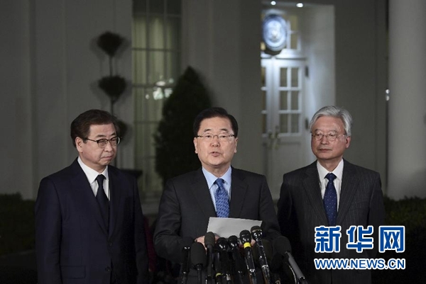 3月8日,正在美國訪問的韓國青瓦臺國家安保室室長鄭義溶(中)在華盛頓白宮說,朝鮮最高領導人金正恩委托韓方向美方轉達他希望盡快與美國總統(tǒng)特朗普會面的意愿,特朗普已經(jīng)同意在5月之前與金正恩會面。新華社/美聯(lián)
