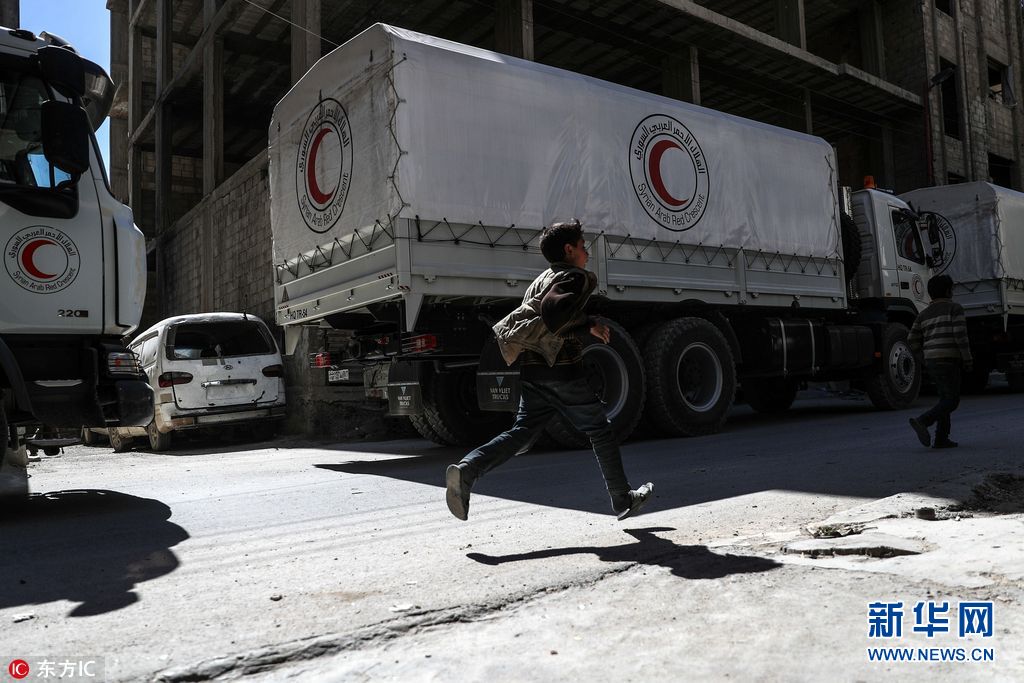 當?shù)貢r間2018年3月9日,敘利亞,推遲多日后,人道主義救援物資進入東古塔反政府武裝控制區(qū)并完成卸貨,共13卡車物資當天上午從瓦菲丁通道進入杜馬區(qū)。(圖片來源:東方IC)
