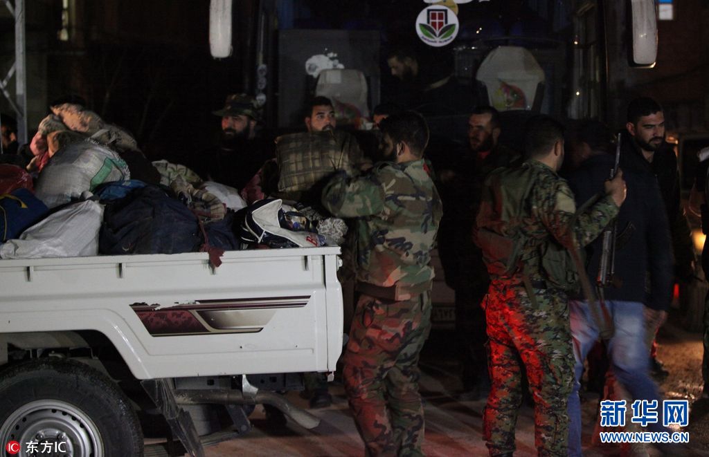 當?shù)貢r間2018年3月9日,敘利亞,首批敘利亞反政府武裝人員從東古塔地區(qū)撤離。(圖片來源:東方IC)