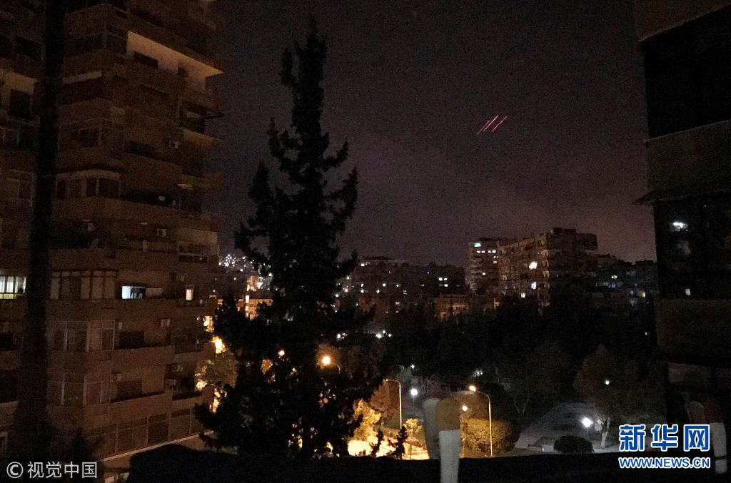 4月14日,敘利亞大馬士革,特朗普決定聯(lián)合英國和法國對敘利亞進行精確打擊,大馬士革傳出爆炸聲,敘利亞方面進行反擊。敘利亞阿拉伯?dāng)⒗麃喭ㄓ嵣?SANA)報道,敘政府軍在大馬士革以南地區(qū)擊落13枚導(dǎo)彈。敘利亞國家電視臺此前稱美英法三國對敘利亞“發(fā)動了侵略”。(圖片來源:視覺中國)