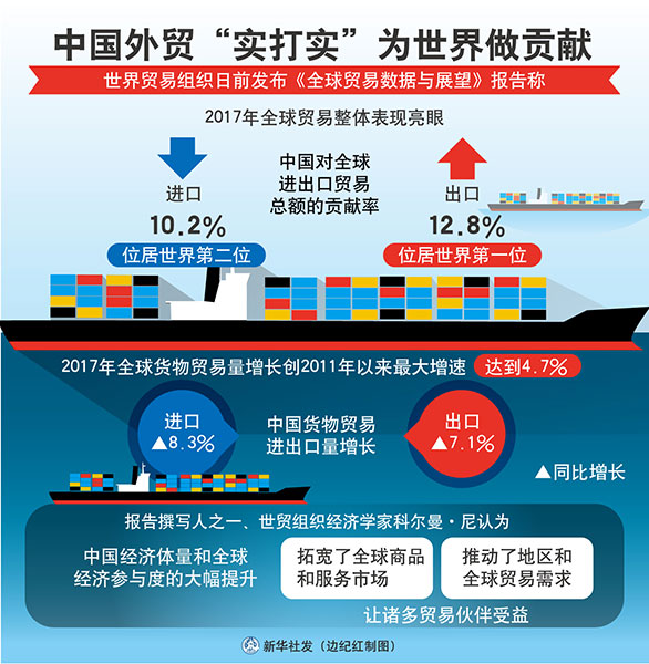 世界貿(mào)易組織日前發(fā)布《全球貿(mào)易數(shù)據(jù)與展望》報告稱,2017年全球貿(mào)易整體表現(xiàn)亮眼,中國對全球進出口貿(mào)易總額的貢獻率高達10.2%和12.8%,分別位居世界第二和第一位。這再次表明,作為世界第一大貨物貿(mào)易國,中國已成為拉動全球貿(mào)易巨輪前行的重要推動力。
