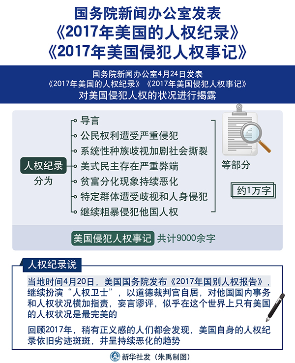 新華社北京4月24日電(記者黃小希、程卓)國務院新聞辦公室24日發(fā)表《2017年美國的人權(quán)紀錄》《2017年美國侵犯人權(quán)事記》,對美國侵犯人權(quán)的狀況進行揭露。