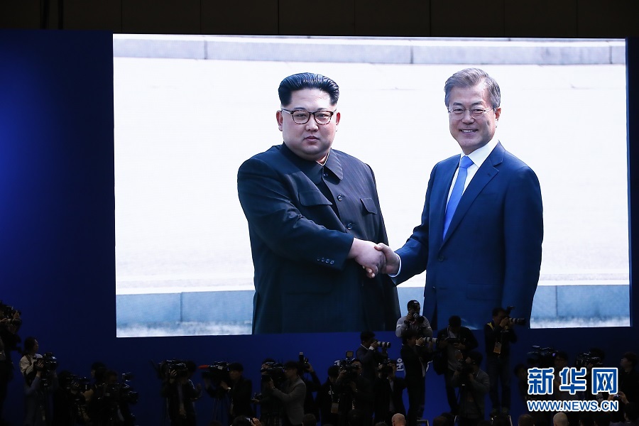 這是4月27日在韓國高陽市媒體中心拍攝的朝鮮最高領(lǐng)導人金正恩(左)與韓國總統(tǒng)文在寅握手的電視畫面。朝鮮最高領(lǐng)導人金正恩27日上午在板門店跨過軍事分界線,與韓國總統(tǒng)文在寅會晤。 新華社記者王婧嬙攝