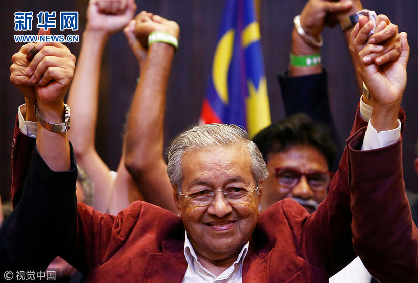 當?shù)貢r間2018年5月9日,馬來西亞吉隆坡,馬哈蒂爾代表希望聯(lián)盟召開新聞發(fā)布會。9日,馬來西亞國會大選結(jié)束。10日凌晨官方點票結(jié)果顯示,前總理馬哈蒂爾(Mahathir)帶領(lǐng)的希望聯(lián)盟取得112席簡單多數(shù)國會議席,足以籌組政府及勝出大選,并終結(jié)執(zhí)政國民陣線長達60年的管治?,F(xiàn)總理納吉布領(lǐng)導(dǎo)的國民陣線僅獲得76席。(圖片來源:視覺中國)