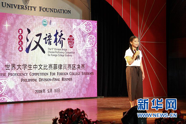 5月11日,在菲律賓安赫萊斯市,此次比賽的冠軍安梓彤在演講。第17屆“漢語(yǔ)橋”世界大學(xué)生中文比賽菲律賓賽區(qū)決賽11日在菲律賓安赫萊斯市舉行。 新華社發(fā)(董成文攝)