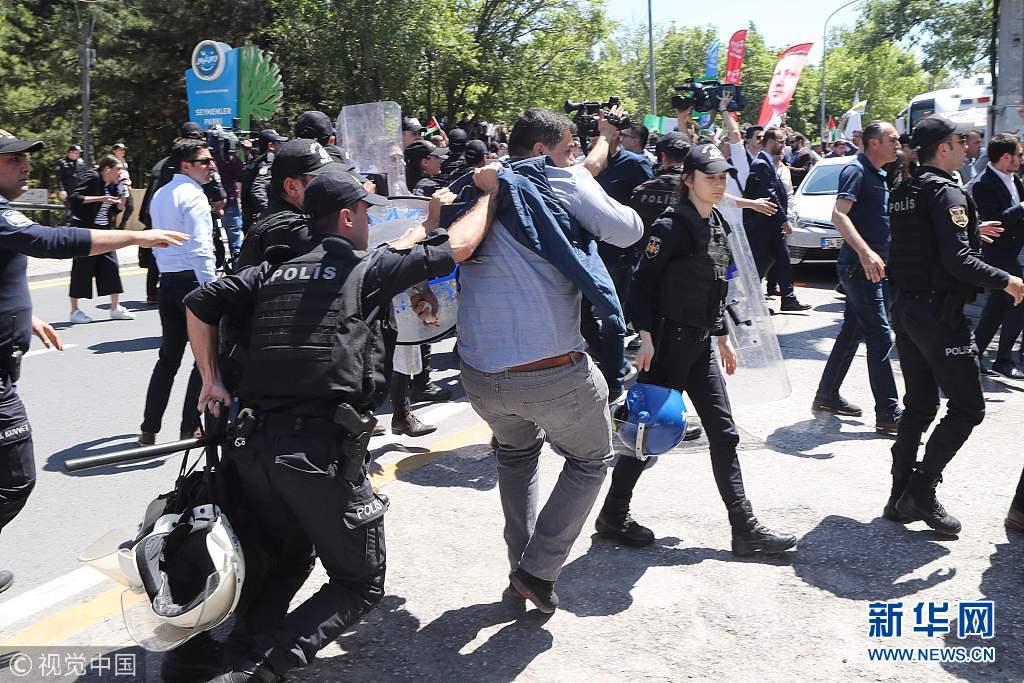 5月15日,土耳其安卡拉,示威者在以色列領(lǐng)事館附近投擲雞蛋和石塊,抗議美國駐以色列使館遷至耶路撒冷。(圖片來源:視覺中國)