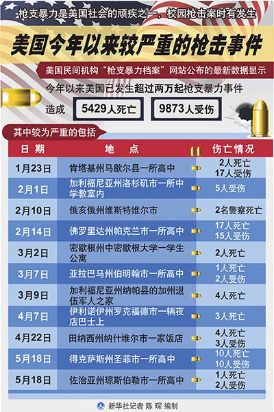 新華社北京5月19日電 新聞背景:美國今年以來較嚴(yán)重的槍擊事件